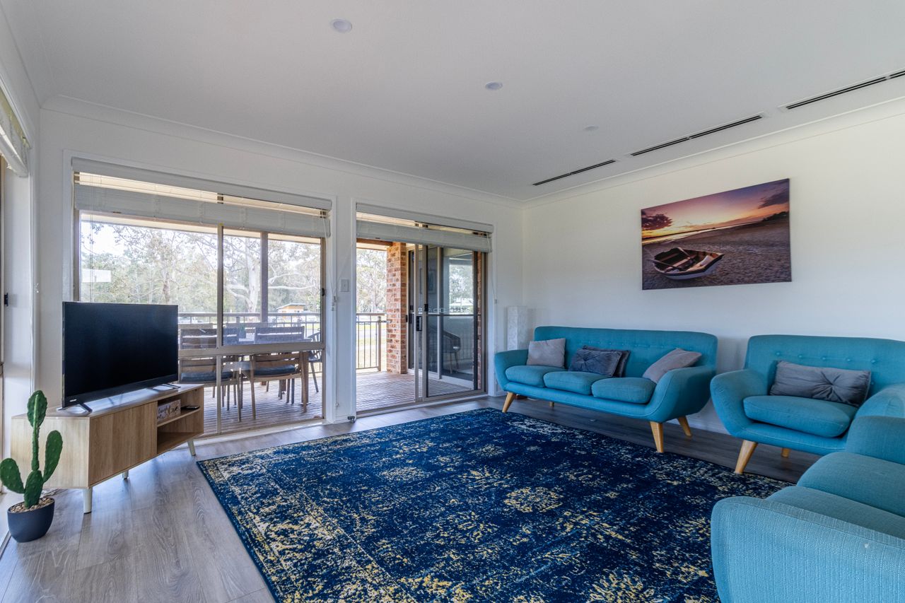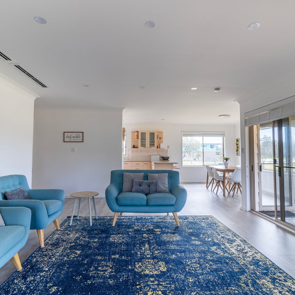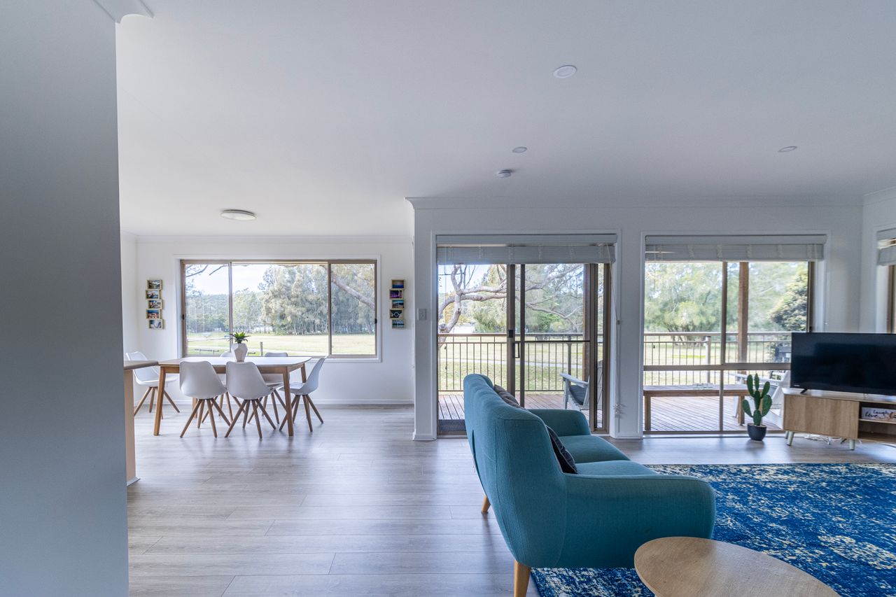 As you step inside Boomerang Retreat, you'll immediately feel a sense of warmth and tranquillity from its three bedrooms and one bathroom, ensuring a comfortable and relaxing stay for everyone. The living area invites you to unwind on the plush sofas.
