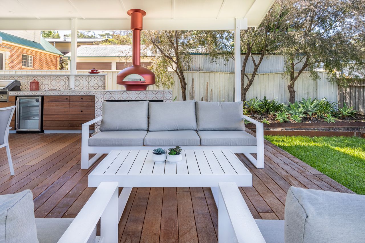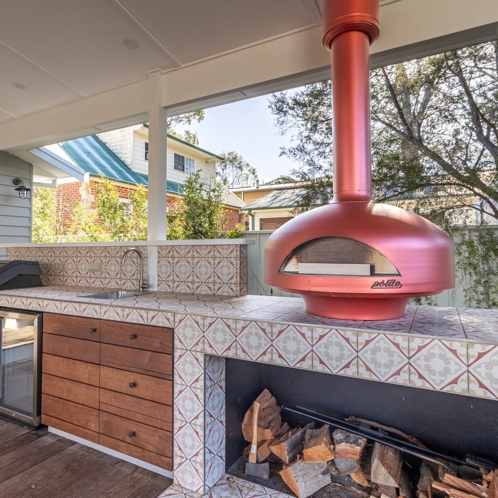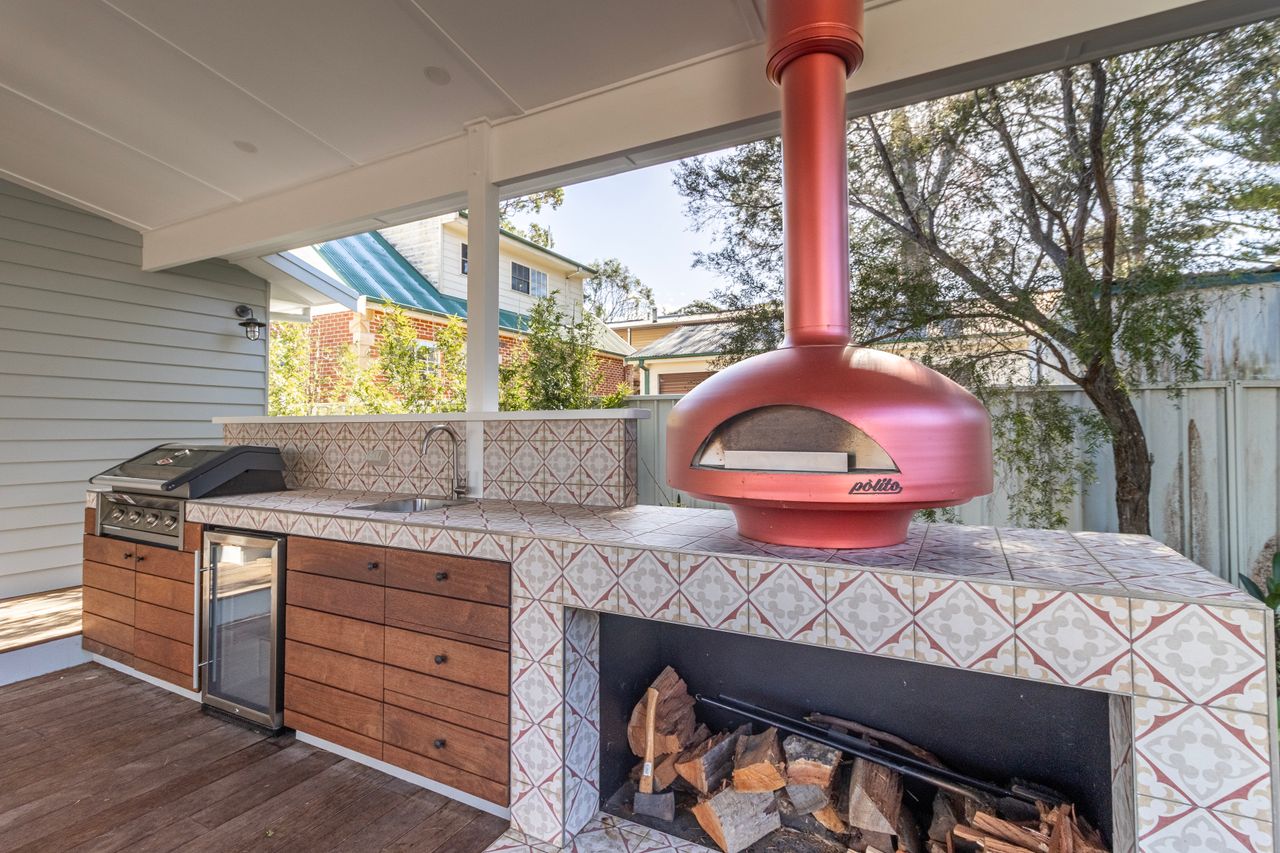 Step outside from the second lounge room and discover a backyard oasis with a spacious patio. The patio features a lounge seating area, a dining table, and an outdoor kitchen equipped with a mini fridge, pizza oven, and BBQ – perfect for al fresco dining and entertaining. Overhead, outdoor fans and heaters are placed to enhance your comfort, ensuring enjoyment of the outdoor space in any weather.